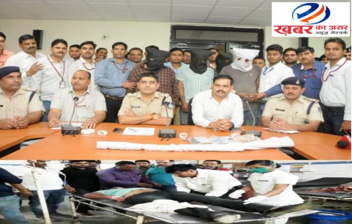 पुलिस हिरासत में लूट के अारोपी। दूसरे चित्र में अस्पताल में भर्ती मुनीम का हाल पूछते एडीजी राजाबाबू सिंह।
