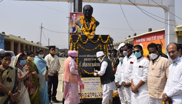 विधायक शैलेन्द्र जैन द्वारा बाबा साहेब डा. भीमराव अम्बेडकर जी जयंती के पावन पुनीत अवसर पर आचार्य विद्यासागर बस स्टेण्ड परिसर में स्वयं की निधि से निर्मित भारत के संविधान निर्माता बाबा साहेब डॉ. भीमराव अम्बेडकर जी की प्रतिमा का अनावरण सामाजिक संत पंचमदास जी महाराज की उपस्थिति में किया गया। उल्लेखनीय है कि आचार्य विद्यासागर बस स्टेण्ड के लोकार्पण के अवसर पर विधायक शैलेन्द्र जैन ने घोषणा की थी कि वह अपनी ओर से बस स्टेण्ड परिसर में बाबा साहेब डाॅ. भीमराव अम्बेडकर जी की प्रतिमा का निर्माण कराएंगे। घोषणा के अनुरूप बस स्टेण्ड परिसर में बाबा साहेब डाॅ. भीमराव अम्बेडकर जी की जयंती के दिन प्रतिमा का अनावरण विधायक शैलेन्द्र जैन एवं सामाजिक संत महाराज पंचमदास के कर कमलों से सोशल डिस्टेंसिंग एवं औपचारिक उपस्थिति के साथ संपन्न हुआ। इस अवसर पर विधायक जैन द्वारा बस स्टेण्ड परिसर में कोविड-19 टीकाकरण महोत्सव के तहत टीकाकरण केंद्र का शुभारंभ किया गया एवं 45 वर्ष से अधिक आयु के लोगों का टीकाकरण भी कराया। इस अवसर पर भीम आर्मी के सदस्यों द्वारा विधायक शैलेन्द्र जैन का आभार व्यक्त किया गया। विधायक जैन ने सभी को कोविड-19 की गाइड लाइंस को अच्छी तरह पालन करने के निर्देश दिए साथ ही उपस्थित लोगों से मास्क पहनने, सोशल डिस्टेंस बनने की अपील की। उन्होंने कहा हमें यह नहीं भूलना है कि कोविड-19 का खतरा अधिक भीड़ वाले स्थान पर जायदा होता है, इसीलिए मास्क अवश्य लगाएं सोशल डिस्टेंस बनाए रखे एवं अपनी बारी आने पर वैक्शीन अवश्य लगवाये। कार्यक्रम में मुख्य रूप से वृन्दावन अहिरवार, धर्मेन्द्र खटीक, चेतराम अहिरवार, डेलन अहिरवार, रामू अहिरवार, पुष्पा ओपी शिल्पी, मनोरमा गौर, शारदा कोरी, प्रतिभा चैबे, रीतेश मिश्रा, नरेश धानक, संगीता हरेन्द्र खटीक, अंकित विश्वकर्मा आदि भाजपा कार्यकर्ता उपस्थित थे।