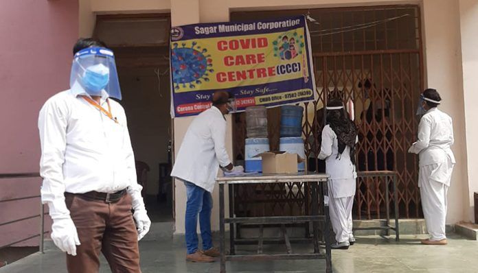 कोविड केयर सेंटर सैनिटाइजर के साथ किया जा रहा है स्वास्थ्य परीक्षण
