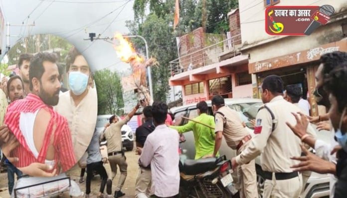 मुख्यमंत्री शिवराज का पुतला जलाने को लेकर पुलिस एवं युवक कांग्रेस कार्यकर्ताओं में झड़प होते देखी गयी को कांग्रेस कार्यकर्ताओं को रोकने के लिए पुलिस ने हल्का बल प्रयोग भी किया