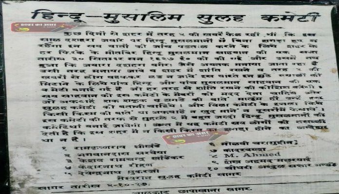 जानकारों ने बताया हैं यह दस्तावेज 1927 का जब भारत में अंग्रेजी हुकुमत थी और मप्र के सागर में आपसी भाईचारे को बचाये रखने के लिए इस शहर के प्रतिष्ठित परिवारों के चुनिंदा लोगो ने जिनको शहर के अमन चैन की फिक्र थी मिलकर एक कमेटी बनाई थी जिसमें 5 सदस्य हिन्दू और 5 सदस्य मुस्लिम समुदाय के थे