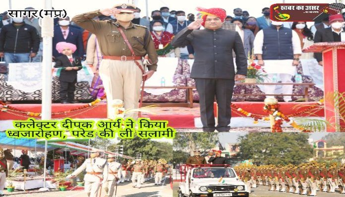 सागर, 26 जनवरी 2022′ सागर जिले में 73वां गणतंत्र दिवस हर्षोल्लास और उमंग के साथ मनाया गया मुख्य समारोह पीटीसी ग्राउण्ड पर भव्य एवं आकर्षक परेड एवं झाकियों के साथ आयोजित किया गया मुख्य अतिथि एवं कलेक्टर दीपक आर्य ने ध्वजारोहण किया और परेड की सलामी ली उन्होनें प्रदेश के मुख्यमंत्री का गणतंत्र दिवस संदेश का वाचन भी किया।