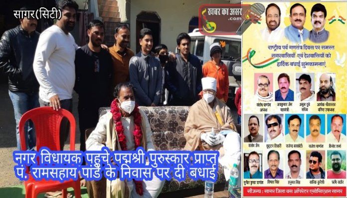 सागर। विधायक शैलेंद्र जैन ने बुंदेली माटी के सपूत सागर के गौरव हमारी लोक कला राई नृत्य को अंतर्राष्ट्रीय मानचित्र पर स्थान बनाने वाले पद्म श्री पुरस्कार प्राप्त सम्मानीय रामसहाय पांडे जी के निवास पर पहुंचकर उनका अभिनंदन और सम्मान किया और उनके लोक कला के प्रति समर्पण को देखते हुए विधायक जैन ने कहा कि आगामी 30 जनवरी दिन रविवार को मोती नगर स्थित महाकवि पद्माकर सभागार में पद्मश्री रामसहाय पांडे जी का नागरिक अभिनंदन किया जाएगा जिसमें सागर शहर के सभी गणमान्य नागरिक लोक कलाओं से जुड़े हुए सभी व्यक्ति उपस्थित रहेंगे।