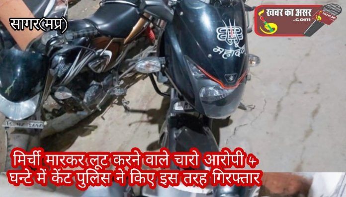 सागर। घटना का संक्षिप्‍त विवरण पुलिस ने बताया कि फरियादी संदीप आठिया ने थाना हाजिर आकर रिपोर्ट लेख कराई कि में ग्राम भोजपुरा में रहता हूं गल्ला मंडी में हम्वाली का काम करता हूं। दिनांक 01.02.22 के रात 9.30 बजे की बात है में अपनी मोटर साईकिल टीव्हीएस स्पोट क्रमाक एमपी 15 एनडी 1608 से अपने घर जा रहा था, कि जैसे ही भैसा पहाडी रोड के नीचे पहुचा तो दो मोटर साईकिल वाले ने मुझे कट मारा और दूसरे मोटर साईकिल वाले ने मेरी गाडी गिरा दी दोनो मोटर साईकिल पर दो-दो व्यक्ति सबार थे। जो बीस पच्चीस साल के थे। मुझे आखों में मिर्ची मारी में जमीन पर गिर गया था मेरे जेब से वीवो कंपनी 12 का मोबाईल जिसमें 7828166261 सिम डली थी एवं जेव से 400 रुपये तथा आधार कार्ड जो मोटर साईकिल मुझसे जबरदस्ती छीनकर ले गये है।