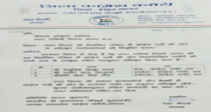 सागर- नगर निगम की नवनिर्वाचित परिषद में कांग्रेस की ओर से निर्वाचित पार्षदों की भूमिका के लिए जिला कांग्रेस अध्यक्ष रेखा चौधरी ने पार्षद दल के पदाधिकारियों की घोषणा कर दी है। जिसके अनुसार बाबूसिंह (बब्बू) यादव को पार्षद दल का नेता तथा ताहिर खान को उपनेता बनाया गया है। इसके अलावा ऋचा सिंह गौंड को पार्टी का सचेतक नियुक्त किया गया है।