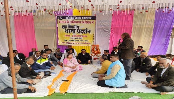 झील पर सालो से जमे अतिक्रमण के विरोध में धरना,