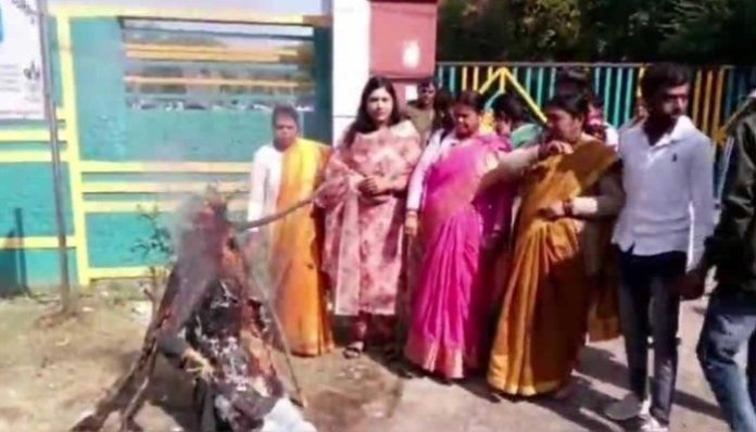 गजेंद्र ठाकुर✍️सागर। सेंट जोसेफ कॉन्वेंट स्कूल में जय श्रीराम के नारे लगाने के बाद विद्यार्थियों को निलंबित करने के मामले ने तूल पकड़ लिया है। मामले के विरोध में हिन्दू एकता संघ की महिलाओं ने मिशनरी स्कूल के गेट पर पहुंचकर प्रदर्शन किया। उन्होंने प्रबंधन का पुतला दहन कर कार्रवाई की मांग की है। विरोध प्रदर्शन की सूचना मिलते ही भारी पुलिस बल मौके पर पहुंचा, फायर फाइटर तैनात की गई। इस दौरान महिलाओं ने विरोध करते हुए पुतला दहन किया। हिन्दू एकता की प्रमुख रेशु चौधरी में कहा कि स्कूल में जय श्रीराम के नारे लगाने पर बच्चों को सस्पेंड किया गया, जो गलत है। मिशनरी स्कूल बंद होना चाहिए। मामले की जांच कर दोषियों के खिलाफ कार्रवाई की जाना चाहिए। हम मांग करते हैं कि मिशनरी स्कूल बंद किए जाए। इनकी जगह पर शासन केंद्रीय विद्यालय खोले।