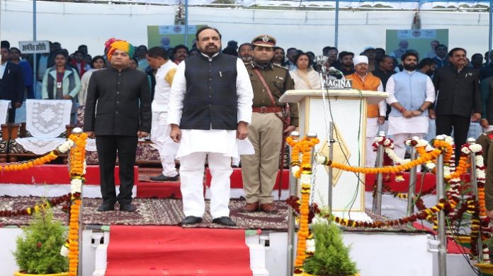 गणतंत्र दिवस समारोह में लोक निर्माण मंत्री श्री भार्गव ने राष्ट्रीय ध्वज फहराया और परेड की सलामी ली। इसके पश्चात राष्ट्रगान का गायन किया गया। कार्यक्रम में मध्यप्रदेश गान का गायन भी किया गया। मुख्य अतिथि ने खुली जीप में कलेक्टर श्री दीपक आर्य और पुलिस अधीक्षक श्री तरूण नायक के साथ परेड का निरीक्षण किया।