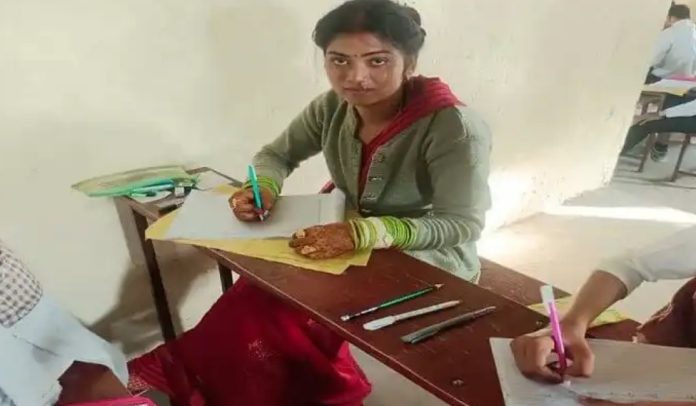 UP: माथे पर ताजा सिंदूर, हाथों में मेंहदी और कलाई में कंगन पहने सजी-संवरी नई नवेली दुल्हन गुरुवार को परीक्षा केंद्र में आकर्षण का केंद्र रही। मायके से विदा होकर ससुराल जाने से पहले दुल्हन ने बोर्ड परीक्षा दी। विदाई की सजी-धजी कार में उसे परीक्षा केंद्र तक दूल्हा और ससुराल के अन्य लोग लेकर आए। परीक्षा समाप्त होने तक दूल्हा सहित अन्य बराती उसका इंतजार करते रहे।