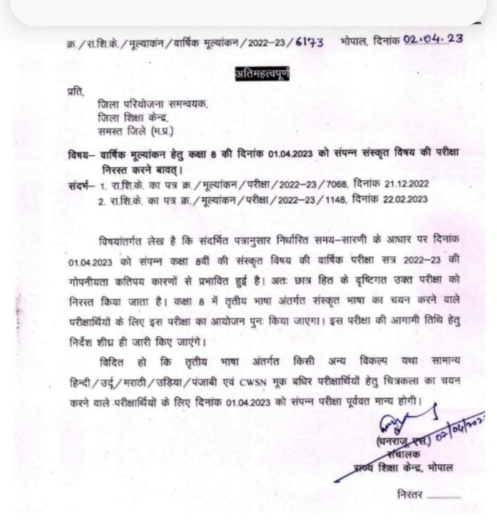 MP: कक्षा आठवीं का संस्कृत का पेपर जो 1 अप्रैल को हुआ था पेपर वह निरस्त कर दिया गया, बताया जा रहा है गोपनीयता भंग हुई है परीक्षा में अब अगली तारीख का इंतजार होगा।