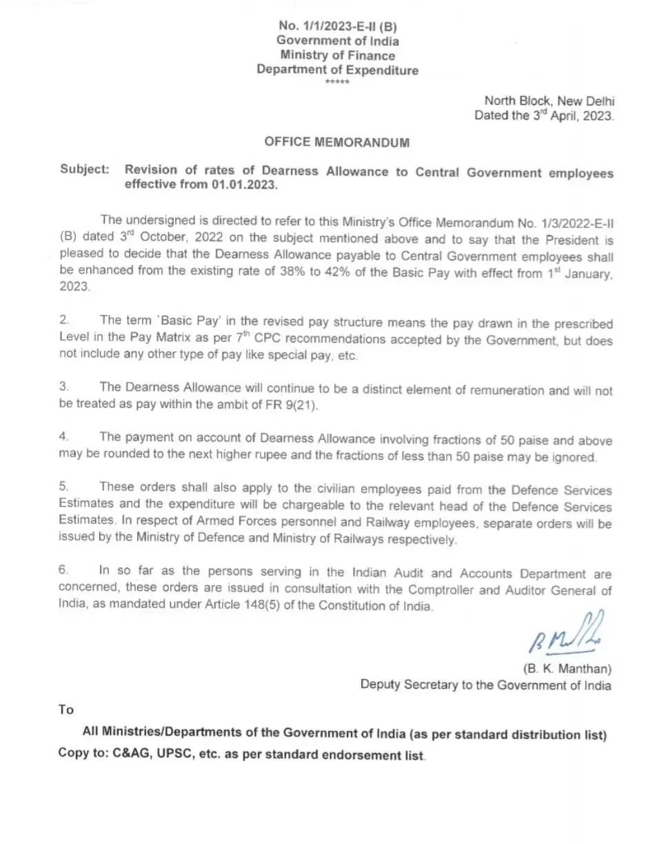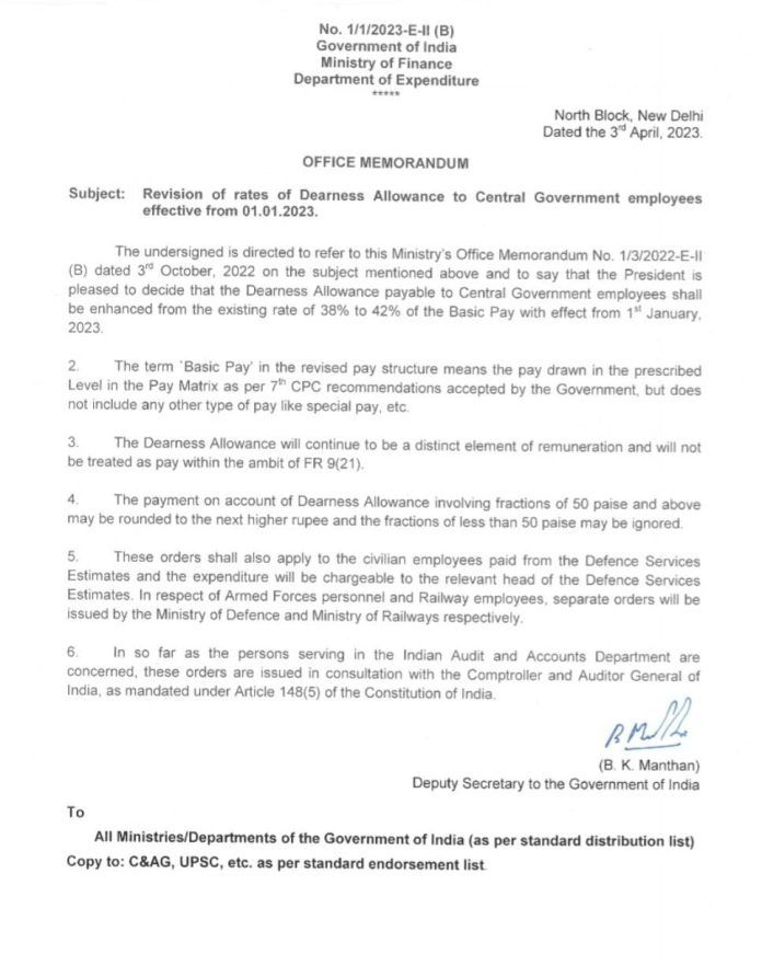 प्रशासनभारत नई दिल्ली: केंद्रीय कर्मचारियों का 4% महंगाई भत्ते का आदेश जारी By खबर का असर .कॉम - April 4, 2023 0 Copy URLFlipKakao StoryGettr नई दिल्ली। केंद्रीय कर्मचारियों का 4% महंगाई भत्ते का आदेश जारी