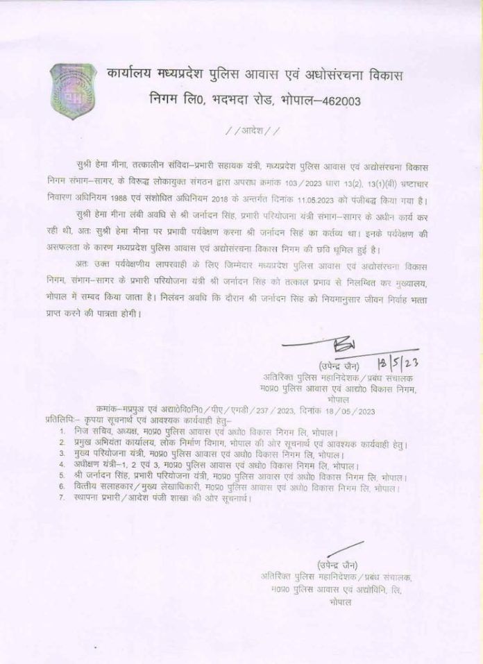 MP: मुख्यमंत्री शिवराज सिंह चौहान के निर्देश पर पर्यवेक्षण में लापरवाही के कदाचरण के क्रम में मप्र पुलिस हाउसिंग कारपोरेशन के परियोजना यंत्री जनार्दन सिंह को निलम्बित किए जाने के आदेश जारी किए गए।