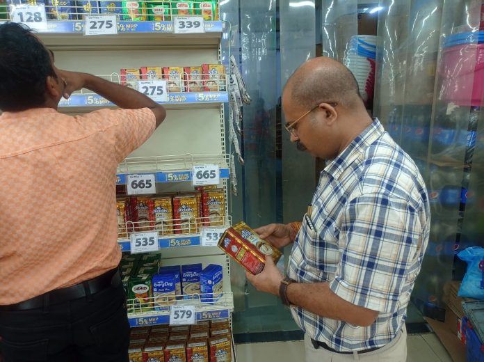 रिलायंस स्मार्ट मकरोनिया में डिब्बाबंद खाद्य सामग्री की जांच हेतु निरीक्षण किया गया