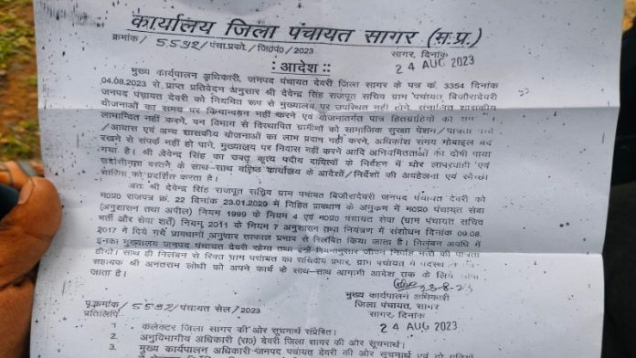 वहीं पंचायत मुख्यालय पर रहकर ईमानदारी से पंचायत के कार्यों का संचालन कर रहे सचिवों पर निलंबन की गाज गिराई जा रही है।ताजा मामला ग्राम पंचायत बिजोरा से जुड़ा हुआ है। ग्राम पंचायत सचिव के निलंबन के बाद पंचायत के विकास कार्य ठप होने पर सरपंच ने भी अपने पद से इस्तीफा देने और भूख हड़ताल करने की चेतावनी दी है। जहां पर पंचायत सचिव देवेंद्र सिंह राजपूत को जिला पंचायत सीईओ ने 24 अगस्त को निलंबन आदेश जारी कर दिया यह आदेश पंचायत सचिव को 21 दिन बाद यानी 13 सितंबर को उसे समय प्राप्त हुआ जब पंचायत सचिव सरपंच के साथ कम को लेकर जनपद पंचायत देवरी पहुंचा तो वहां उन्हें निलंबन का आदेश थमा दिया गया।
