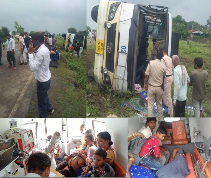 सागर- बंडा रोड पर पलटी खुशबू ट्रेवल्स की यात्री बस, बस खंती में पलटी, 13 यात्री घायल, परिवहन विभाग की अनदेखी, यात्री हलकान