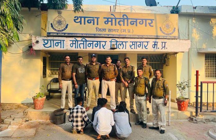 पुलिस के मुताबिक शनिवार देर रात थाना प्रभारी मोतीनगर को मुखबिर से सूचना मिली थी कि 5 सशस्त्र बदमाश कट्टा, रॉड, छुरा, चाकू और लूट की अन्य सामग्री लेकर महेश दाल मील के सामने मंडी बायपास ईंट भट्टे के पास बैठकर डकैती करने की योजना बना रहे हैं। सूचना मिलते ही पुलिस ने कार्रवाई के लिए टीमें गठित की। 4 पुलिस टीमें तैयार कर कार्रवाई के लिए रवाना की गई। टीमों ने मौके पर पहुंचकर घेराबंदी की और मुखबिर के बतायानुसार स्थान पर दबिश दी। कार्रवाई करते हुए पुलिस ने आरोपियों को धरदबोचा। कार्रवाई के दौरान 5 सशस्त्र बदमाश आपस में बाइपास स्थित पेट्रोल पंप को लूटने की योजना बना रहे थे मामले में कार्रवाई करते हुए पुलिस ने निगरानी गुंडा आरोपी गोलू उर्फ यश कोरी उम्र 22 साल, उदय पिता प्रदीप अहिरवार उम्र 19 साल दोनों निवासी इतवारी टौरी, नीलेश पिता देवेन्द्र पटेल उम्र 23 साल निवासी धर्माश्री आवासीय कालोनी सागर, आजाद पिता रामेश्वर प्रसाद सेन उम्र 23 साल निवासी संतरविदास वार्ड और शरद पिता संजय वाल्मीक उम्र 19 साल निवासी राजीव नगर वार्ड सागर को हिरासत में लिया।