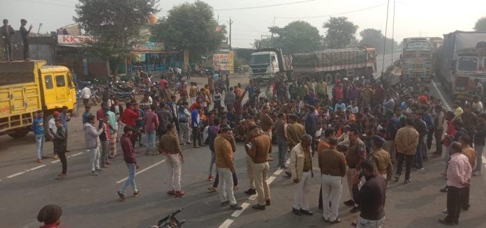 जिसके कारण आवागमन बाधित हो गया एवं सड़क पर वाहनों की लंबी कतारे लग गई। सूचना मिलने के बाद पहुँची पुलिस ने अप्रिय स्थिति से निपटने के लिए बल तैनात किया इस दौरान थाना प्रभारी रोहित डोंगरे सहित पुलिस अधिकारी मौके पर पहुँच गये।