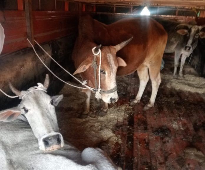 सागर। खुरई पुलिस को मुखबिर की सूचना मिली कि ग्राम मोठी में कुछ अज्ञात लोग मवेशियों को भरकर वध करने के लिए ले जा रहे हैं जिसपर एएसआई आरके तिवारी द्वारा पुलिस टीम के साथ दबिश दी गई तो कुछ लोग आयशर ट्रक क्रमांक एम पी 09 GJ 3471 मैं मवेशी भरते हुए दिखे जो पुलिस को देखकर भागे कुछ मवेशी उनके द्वारा छोड़ देने पर जंगल की ओर भाग गए मौके पर घेराबंदी कर पर दो आरोपी पकड़ में आए