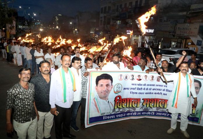 सागर । आज जिला शहर कांग्रेस कमेटी के तत्वाधान में बिजनेस कांक्लेब के लिए लगाए गए टेंटो में बारह करोड़ के खर्च में भ्रष्टाचार,मध्यभारत एग्रो जैसी फैक्ट्री से हो रहे प्रदुषण, भाजपा शासन में हो रहे भ्रष्टाचार, स्मार्ट सिटी का भ्रष्टाचार,प्राइवेट अस्पतालों को बिना सुविधाओं के लाइसेंस देना,तालाब सफाई घोटाला आदि को लेकर कांग्रेस कार्यालय गौर मूर्ति से राधा तिराहा तक विशाल मशाल जुलूस निकाला गया।मशाल जुलूस मुख्यमंत्री एवं प्रदेश शासन द्वारा की जा रहीं अंदेखी एवं भाजपा शासन के द्वारा किये जा रहे भ्रष्टाचार के बिरोध में कांग्रेस ने प्रदर्शन किया हैँ। इस विशाल मशाल जुलूस का नेतृत्व जिला शहर कांग्रेस कमेटी के अध्यक्ष राजकुमार पचौरी ने किया ।