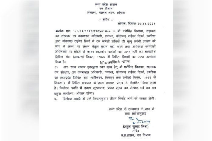 प्रशासनमध्य प्रदेश बांधवगढ़ टाइगर रिजर्व में हाथियों की मृत्यु संबंधी प्रकरण में अधिकारी निलंबित By खबर का असर .कॉम - November 3, 2024 0 Copy URLFlipKakao StoryGettr MP: फतेसिंह निनामा, सहायक वन संरक्षक, उप वनमण्डल अधिकारी, पनपथा, उमरिया को बांधवगढ़ टाइगर रिजर्व में 10 जंगली हाथियों की मृत्यु संबंधी प्रकरण में निलंबन का आदेश जारी