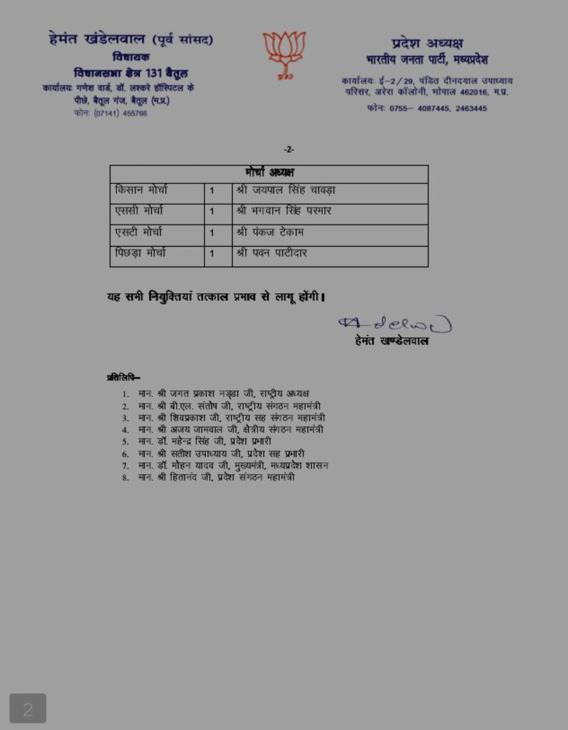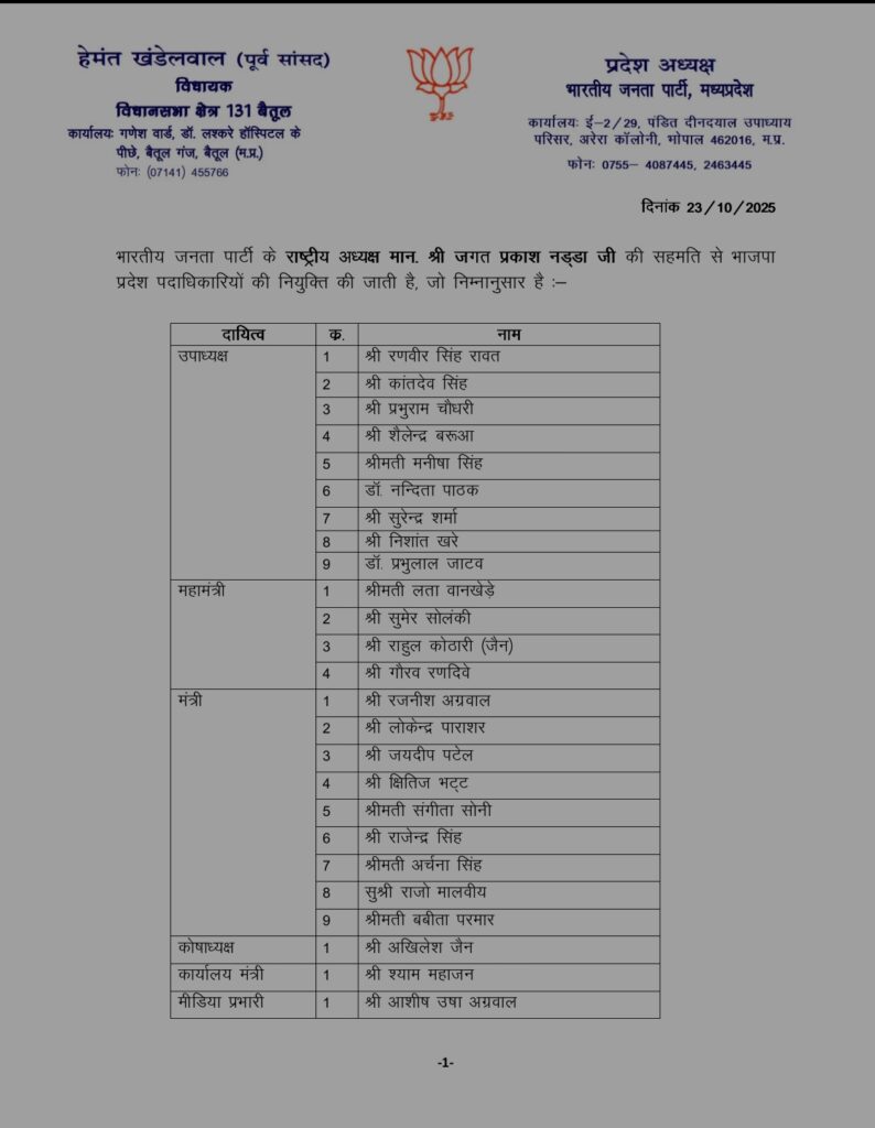 BJP की प्रदेश कार्यकारिणी की घोषणा, सूची जारी भोपाल। भारतीय जनता पार्टी के प्रदेश अध्यक्ष एवं विधायक हेमंत खंडेलवाल ने गुरुवार को ...