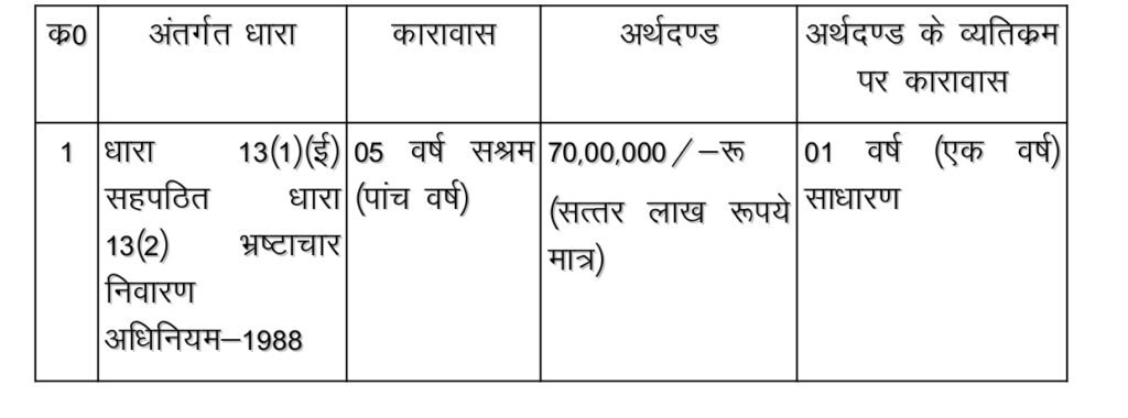 सज़ा -माननीय न्यायालय द्वारा विचारण उपरांत दिनाँक 31.10.2025 को पारित निर्णय में आरोपी को दोषसिद्ध पाते हुए धारा 13(1) ई, 13(2) पीसी एक्ट में 05 वर्ष का सश्रम कारावास एवं 70 लाख रुपए के अर्थदंड से दंडित किया गया।