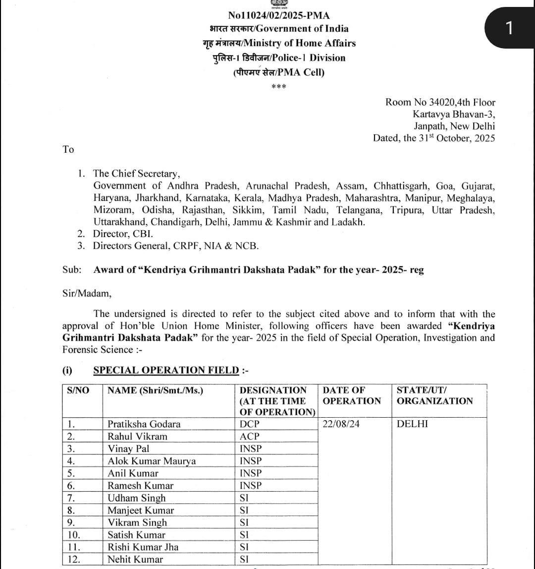 केंद्रीय गृह मंत्री दक्षता पदक वर्ष 2025 में प्रदेश के 4 अधिकारी सम्मानित