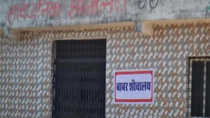 हिंदूवादी संगठनों का हंगामा: सुलभ शौचालय पर लगाए ‘बाबर’ के पोस्टर