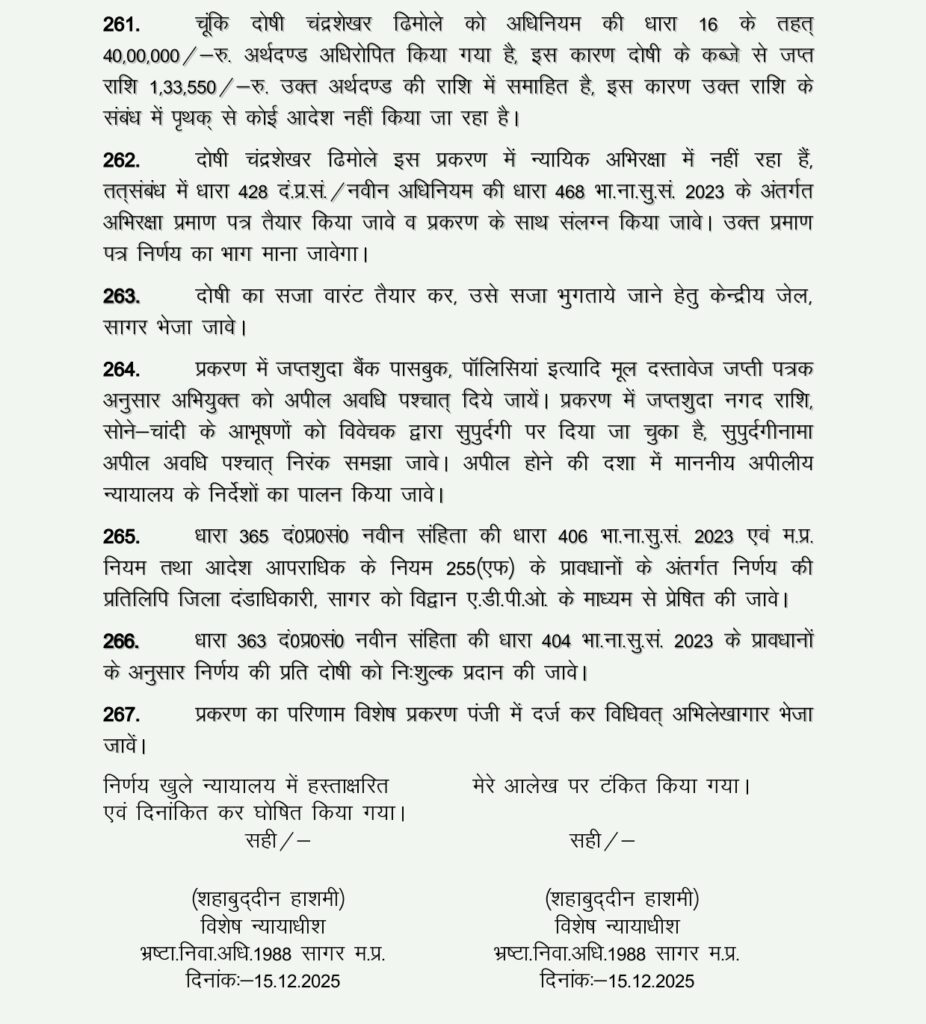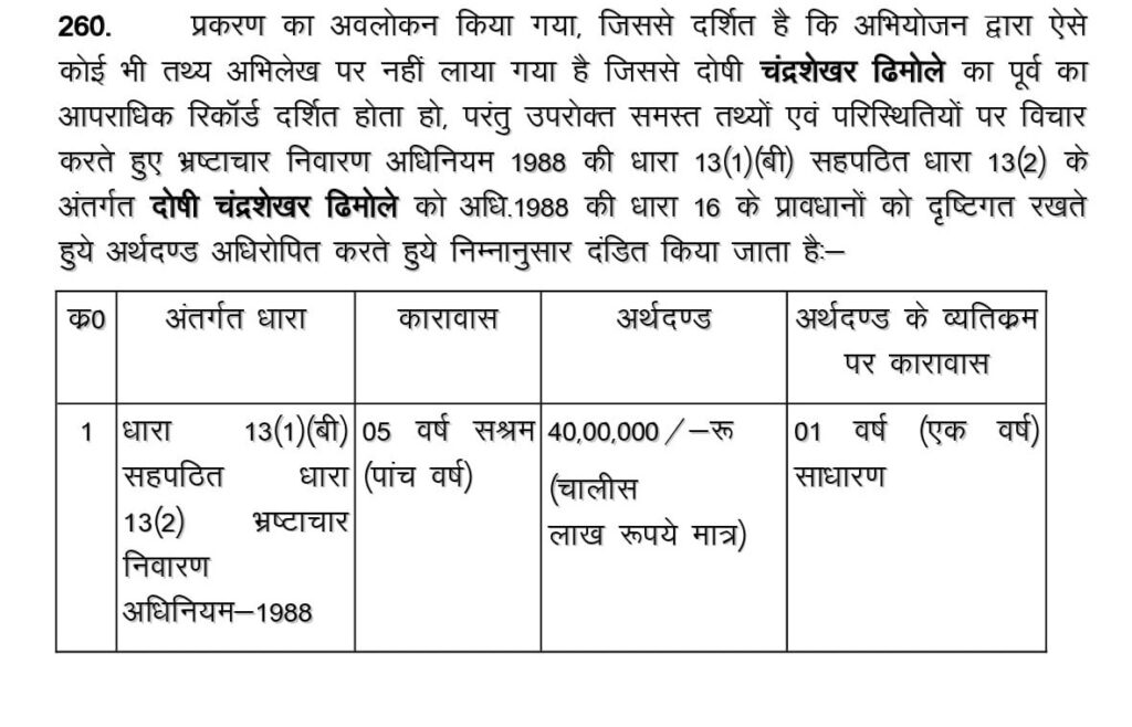 सागर। अभियुक्त चंद्रशेखर ढिमोले के विरूद्ध भ्रष्टाचार निवारण अधिनियम, 1988 (एतस्मिन पश्चात अधि. 1988) की धारा 13 (1) (बी) सपठित धारा 13 (2) के अंतर्गत दण्डनीय अपराध के आरोप हैं कि उसने प्राथमिक आदिम जाति सहकारी समिति रसेना तहसील देवरी जिला सागर में सहायक समिति प्रबंधक के पद पर अर्थात् लोकसेवक रहते हुये वर्ष 1996 से दिनांक 28.08.2019 तक की चैक पीरियड अवधि में आय के वैध स्रोतों से अर्जित कुल आय 68,64,066/-रु. (अड़सठ लाख चौंसठ हजार छियासठ हजार रुपये) थी, जबकि उक्त अवधि में व्यय 1,27,18,195/-रु. (एक करोड़ सत्ताईस लाख अठारह हजार एक सौ पंचानवे हजार रुपये) था, इस प्रकार कुल 58,54,129/- रु.