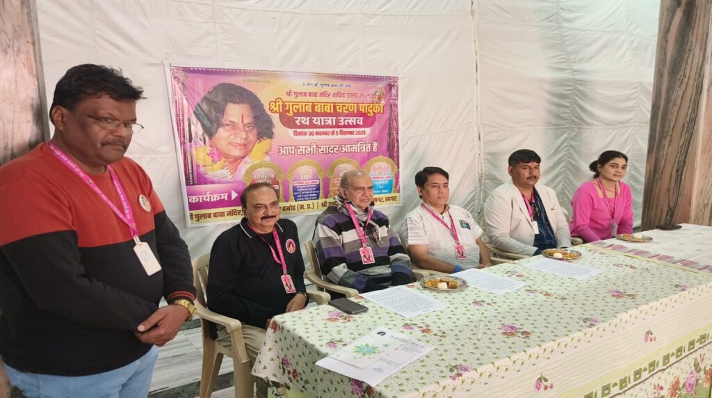 सागर। निप्र – हिंदु सनातनी धर्म परम्परा के अनुसार, बुंदेलखण्ड के अति भव्य एव सुंदर मंदिरों में से एक एवं देशभर के श्री गुलाब बाबा भक्तों के श्रृद्धा का केन्द्र श्री गुलाब बाबा मंदिर, सागर के 18वें वार्षिक उत्सव का शुभारंम 30 नवम्बर को नरसिंहगढ़ (दमोह) से हर वर्ष की तरह 111 किलोमीटर के पैदल एवं वाहनों द्वारा आई “श्री गुलाब बाबा चरण पादुका पालिकी रथयात्रा” का बहेरिया तिगड्डा, सागर से 3 दिसम्बर 2025 दिन बुधवार सुबह 10:30 बजे विशाल शोभायात्रा के रूप में श्री गुलाब बाबा मंदिर में “श्री गुलाब शक्तिपोठ’ पर चरण पादुका स्थापना के साथ होगा।