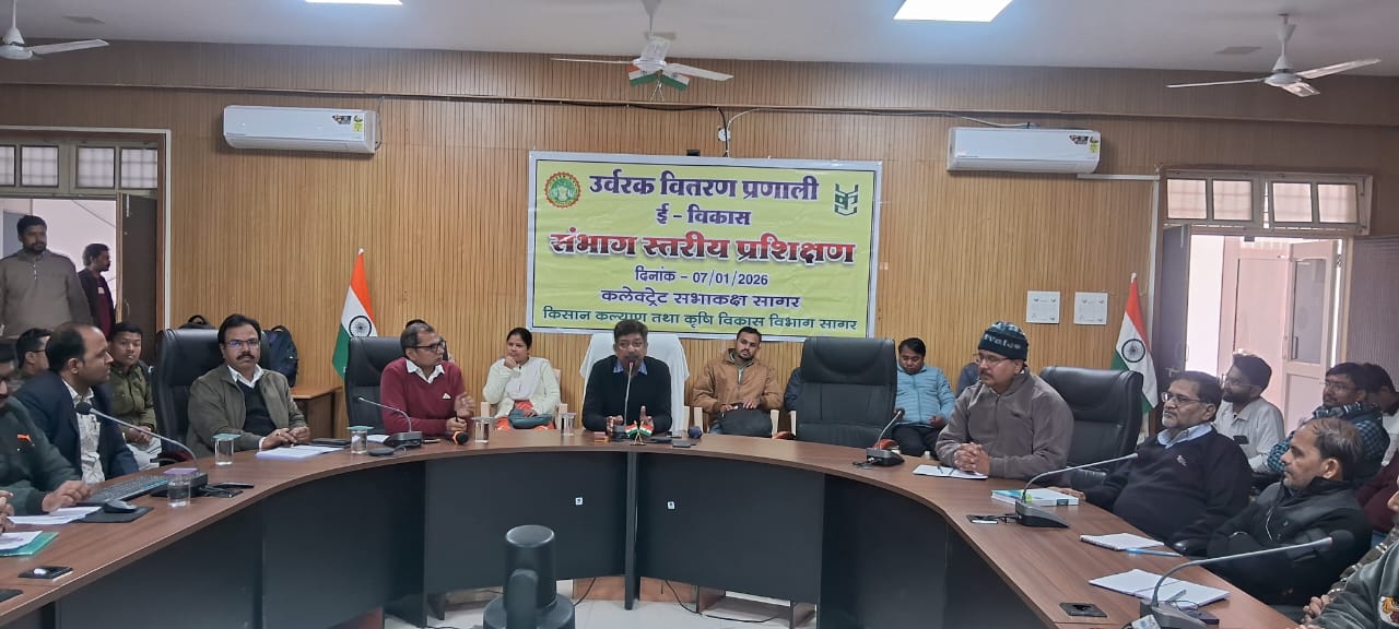 सागर। म. प्र शासन किसान कल्याण तथा कृषि विकास के निदेशानुसार आज दिनांक 07 जनवरी 2026 को श्री अविनाश रावत अपर कलेक्टर सागर की अध्यक्षता में संभाग स्तरीय उर्वरक वितरण की नवीन प्रणाली ई-विकास पोर्टल से संबंधित समस्त अधिकारियों का संभाग स्तरीय, प्रशिक्षण आयोजित किया गया। जिसमें संयुक्त संचालक कृषि श्री राजेश त्रिपाठी, संयुक्त आयुक्त सहकारिता, क्षेत्रीय प्रबंधक मार्कफेड, क्षेत्रीय प्रबंधक एम०पी० एग्रो एवं संभाग की समस्त उप संचालक कृषि परियोजना संचालक आत्मा, उप आयुक्त सहकारिता, जिला विपणन अधिकारी, मुख्य कार्यपालन अधिकारी जिला सहकारी केंद्रीय बैंक, वरिष्ठ कृषि विकास अधिकारी, प्रबन्धक प्राथमिक कृषि सहकारी समिति को उर्वरक वितरण हेतु कृषकों ई-टोकन प्रणाली के माध्यम से उर्वरक उवलब्धता सुनिश्चित करानें हेतु क्रिस्प भोपाल से आये आई०टी० अधिकारी द्वारा पोर्टल के बारे में विस्तृत जानकारी उपलब्ध कराई गई एवं मैदानी अमले बताई गई समस्याओं का समाधान किया गया।