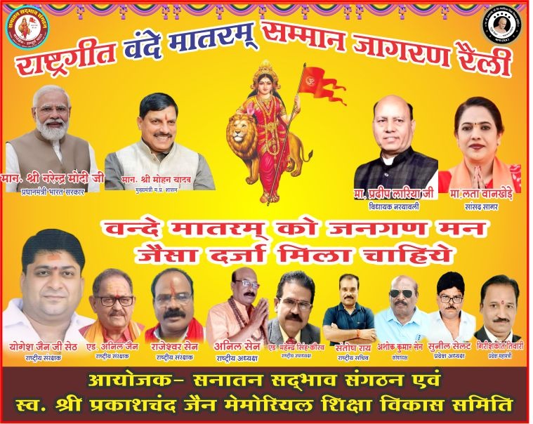 नरयावली विधानसभा क्षेत्र के विधायक इंजी. प्रदीप लारिया के आह्वान पर आयोजित ‘वंदे मातरम्’ सम्मान जागरण रैली में जनसैलाब उमड़ पड़ा। इस विशाल रैली का उद्देश्य राष्ट्रगीत ‘वंदे मातरम्’ को राष्ट्रगान ‘जन-गण-मन’ के समान सम्मान दिलाना था, और यह आयोजन अपने उद्देश्य में पूरी तरह सफल रहा।