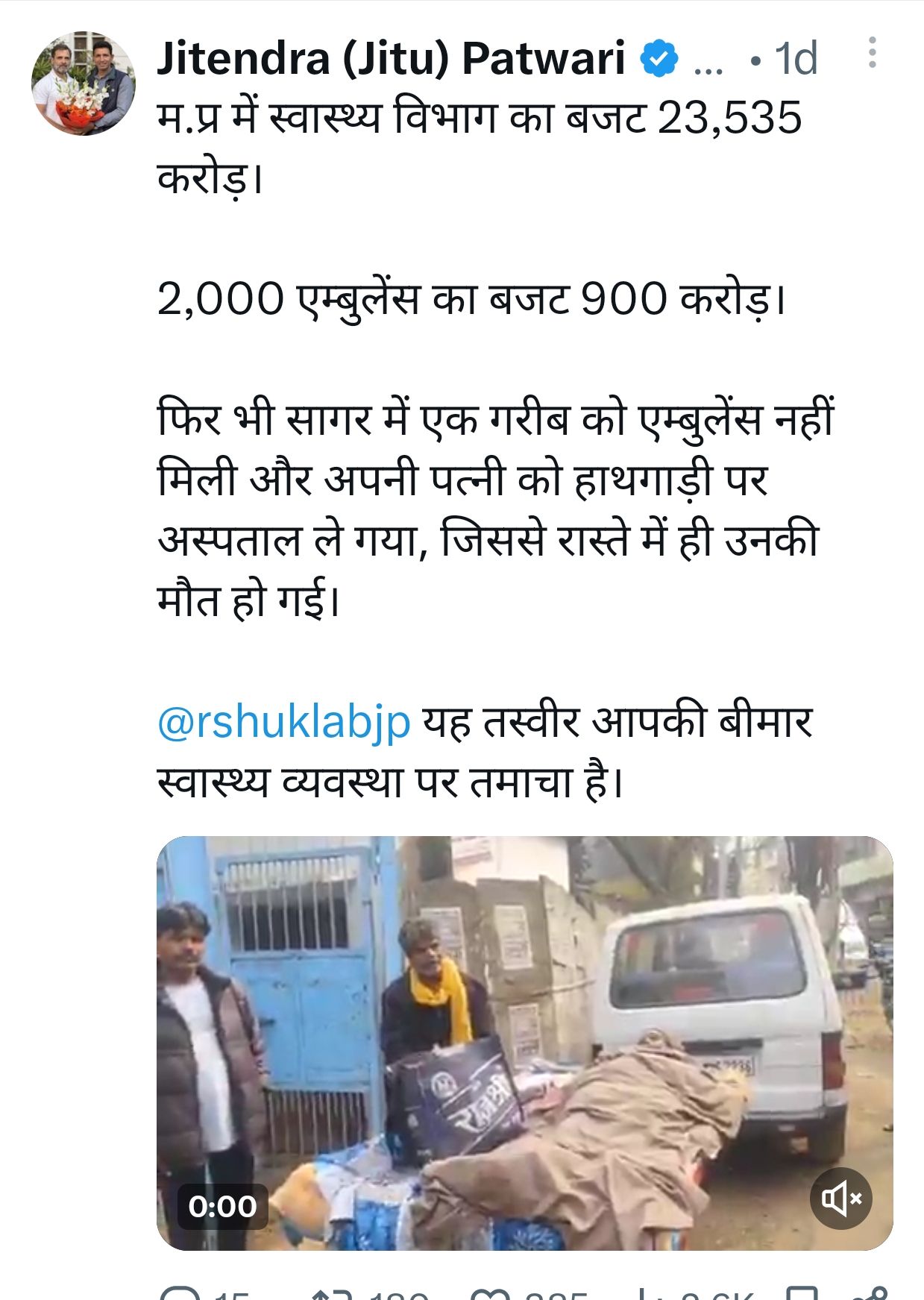 जीतू पटवारी ने सोशल मीडिया प्लेटफॉर्म X पर वीडियो साझा करते हुए प्रदेश सरकार और स्वास्थ्य विभाग पर तीखा हमला बोला। उन्होंने लिखा कि मध्य प्रदेश में एम्बुलेंस सेवाओं के लिए करीब 900 करोड़ रुपये का बजट है, इसके बावजूद सागर जैसे जिले में एक गरीब व्यक्ति को एम्बुलेंस तक नसीब नहीं हुई। उन्होंने इस घटना को स्वास्थ्य विभाग की कार्यप्रणाली पर “तमाचा” बताते हुए सरकार को कठघरे में खड़ा किया।
