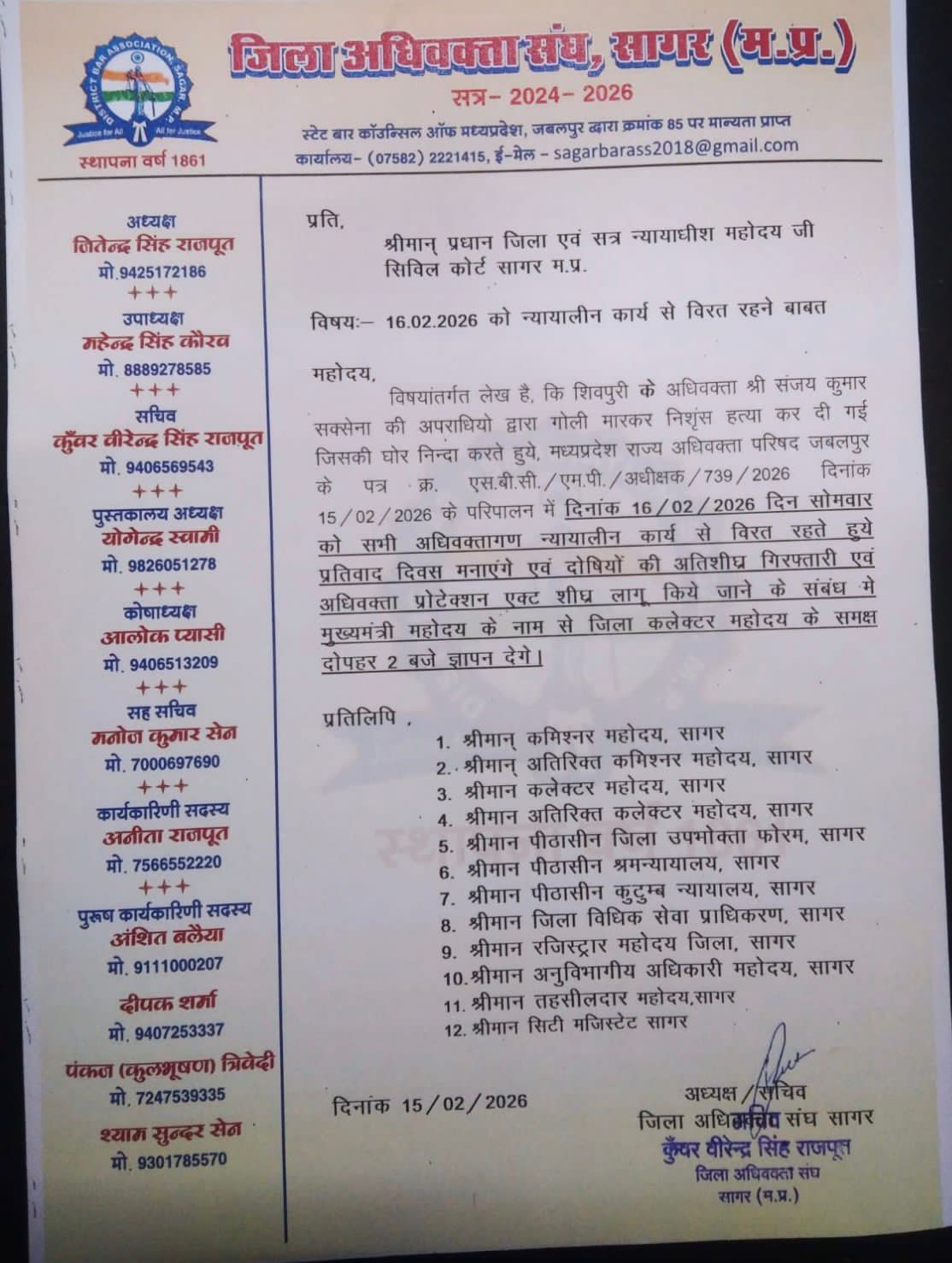 जबलपुर। एमपी के शिवपुरी जिले के करैरा में एक अधिवक्ता संजय सक्सेना को गोली मार कर की गई दिनदहाड़े हत्या के विरोध में पूरे राज्य के वकीलों ने सोमवार 16 फरवरी को प्रतिवाद दिवस मनाएंगे. इस दौरान वे न्यायलीयन कार्य से विरत रहेंगे.