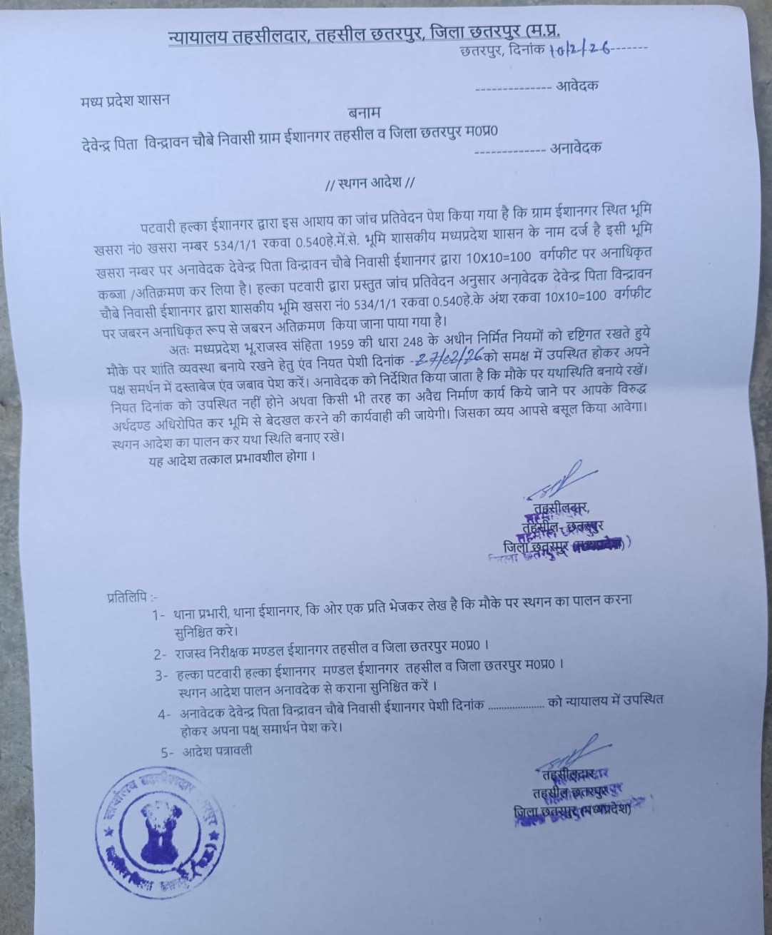 तहसीलदार द्वारा स्थान आदेश जारी कर नियत तिथि पर जवाब प्रस्तुत करने के निर्देश दिए गए हैं। चेतावनी दी गई है कि अनुपस्थित रहने या अवैध निर्माण जारी रखने पर बेदखली की कार्रवाई की जाएगी और खर्च संबंधित व्यक्तियों से वसूला जाएगा।