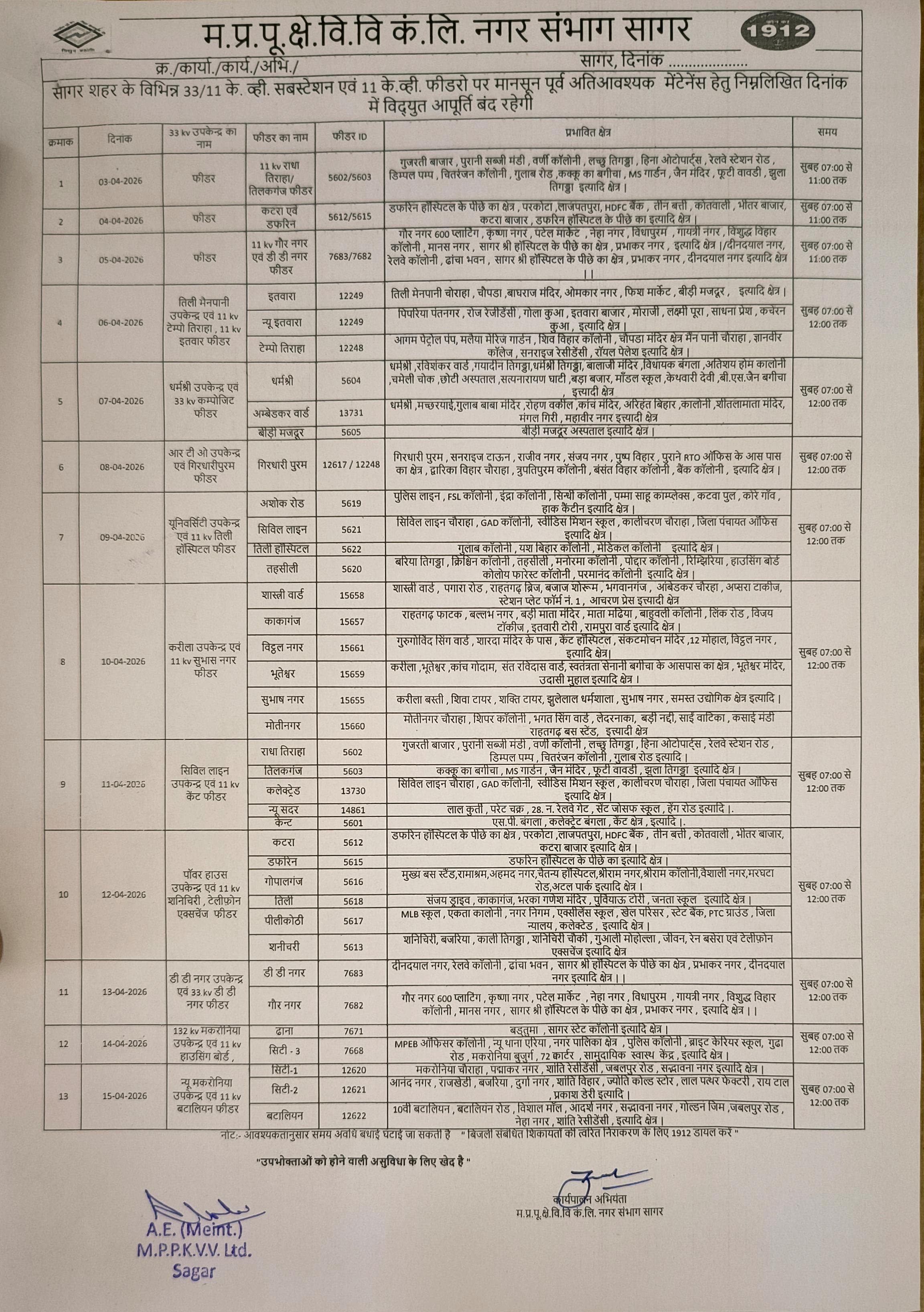 | 13 अप्रैल | दीनदयाल नगर, रेलवे कॉलोनी, ढाबा भवन, सागर श्री अस्पताल क्षेत्र, गौर नगर। | सुबह 07:00 से 12:00 |