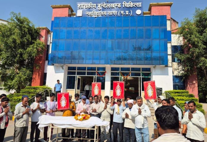 सागर। बुंदेलखंड चिकित्सा महाविद्यालय (बीएमसी) में शुक्रवार, 24 अप्रैल 2026 को रहली निवासी 54 वर्षीय स्व. श्री किशन के परिजनों ने उनकी अंतिम इच्छानुसार पार्थिव शरीर को एनाटॉमी विभाग में देहदान किया। शासन के नवीन निर्देशों के पालन में, संस्थान में यह सातवां अवसर रहा जब किसी देहदाता को पूरे राजकीय सम्मान के साथ ‘गार्ड ऑफ ऑनर’ प्रदान किया गया।