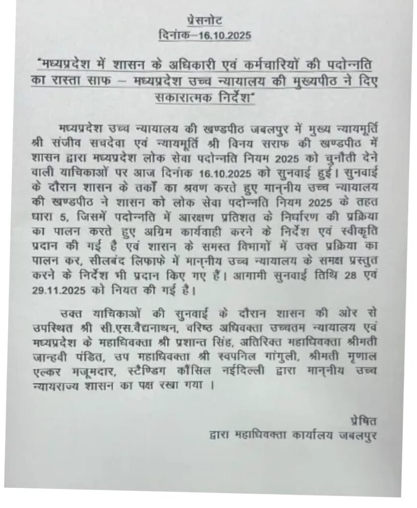 ब्रेकिंग न्यूज जबलपुर। उच्च न्यायालय जबलपुर का आज हुई पदोन्नति मामले के संबंध में सकारात्मक निर्देश। CS ने कल बुलाई