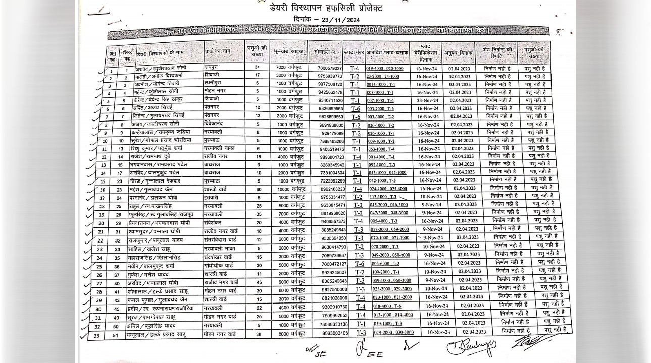 डेयरी विस्थापन परियोजना के अपात्र पाए गए 180 व्यक्तियों को आवंटित प्लाटों के आवंटन को निरस्त किया